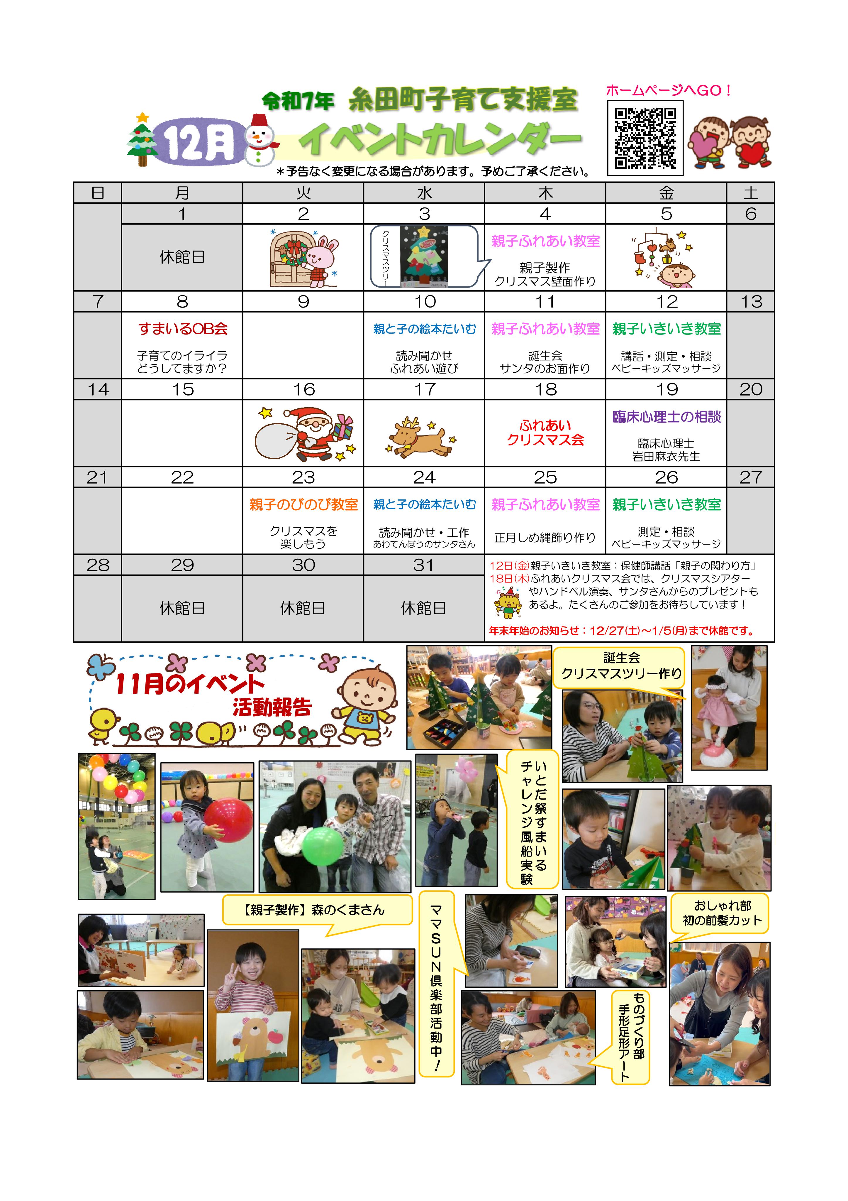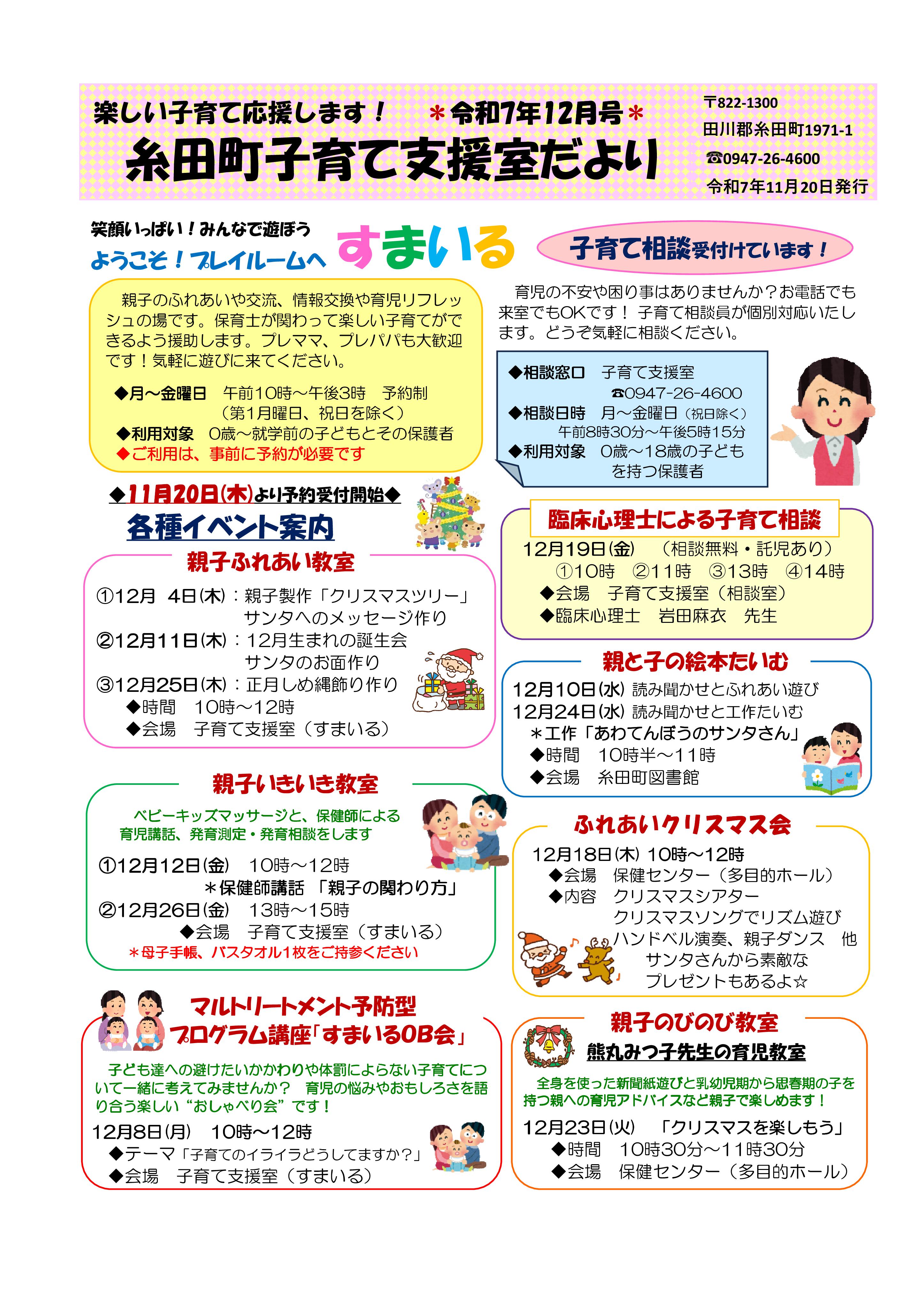 おかげさまで開室から14年目を迎えました。プレイルーム「すまいる」は、ふれあいの場であり、情報交換や育児リフレッシュのできる場です。お父さん、お母さんだけでなく、プレママ、プレパパも大歓迎です。おじいちゃん、おばあちゃんもお孫さんを連れて気軽にご利用ください。家庭内だけでの子育ては、大人にとっても子どもにとってもストレスの元。たくさんの出会いや笑顔あふれる関わりの中で、豊かな心は育ちます。子育てには地域の支えあいが必要です。同支援室は、これからもみなさんと共に手を取りあって、楽しい子育てができるよう応援していきます!令和7年度 プレイルームのご利用とイベント案内