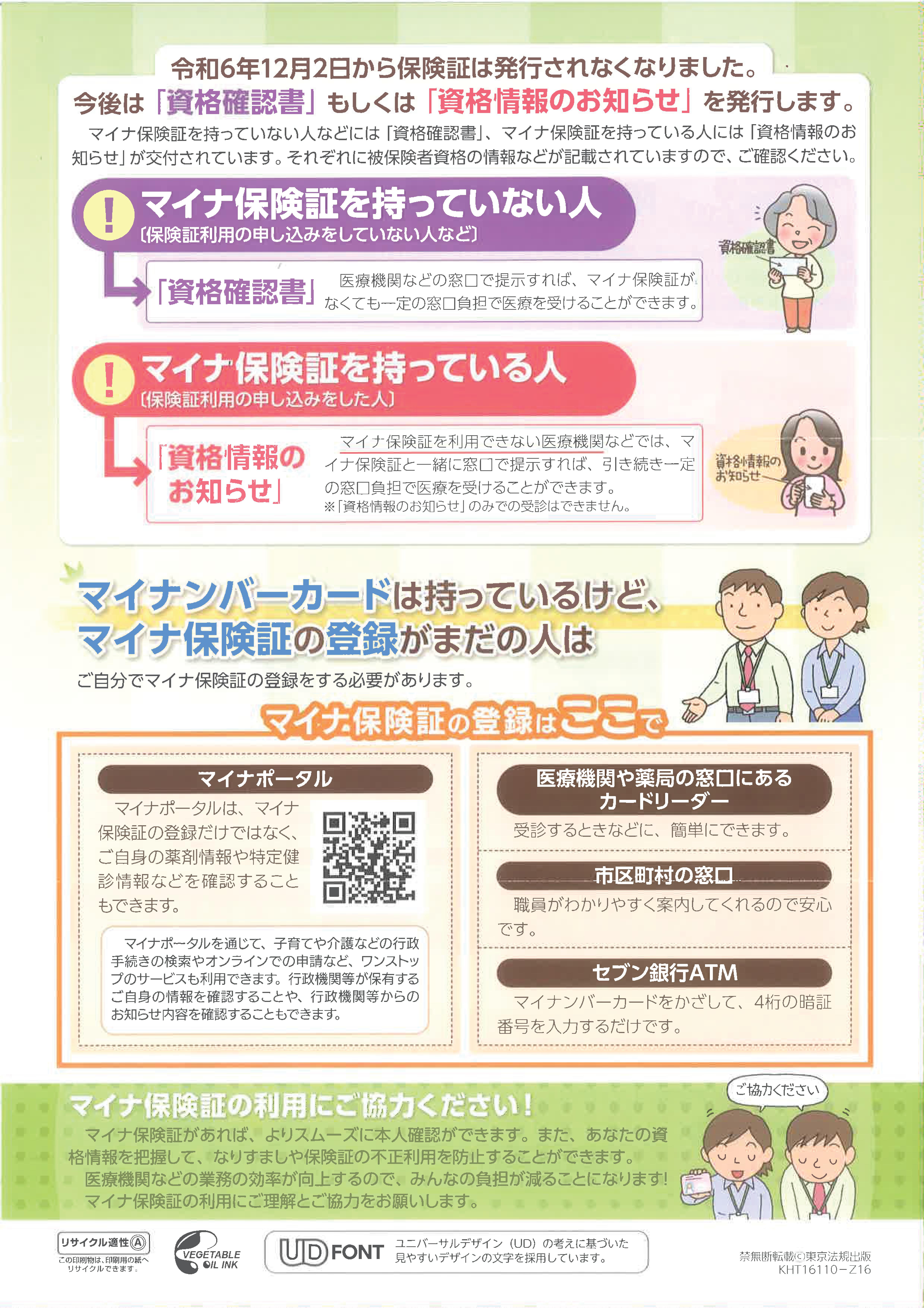 なお、マイナ保険証をお持ちの人については、ご自身の資格情報を確認できるよう、「資格情報のお知らせ」を交付する予定です。(「資格情報のお知らせ」のみでは医療機関等を受診できません。)