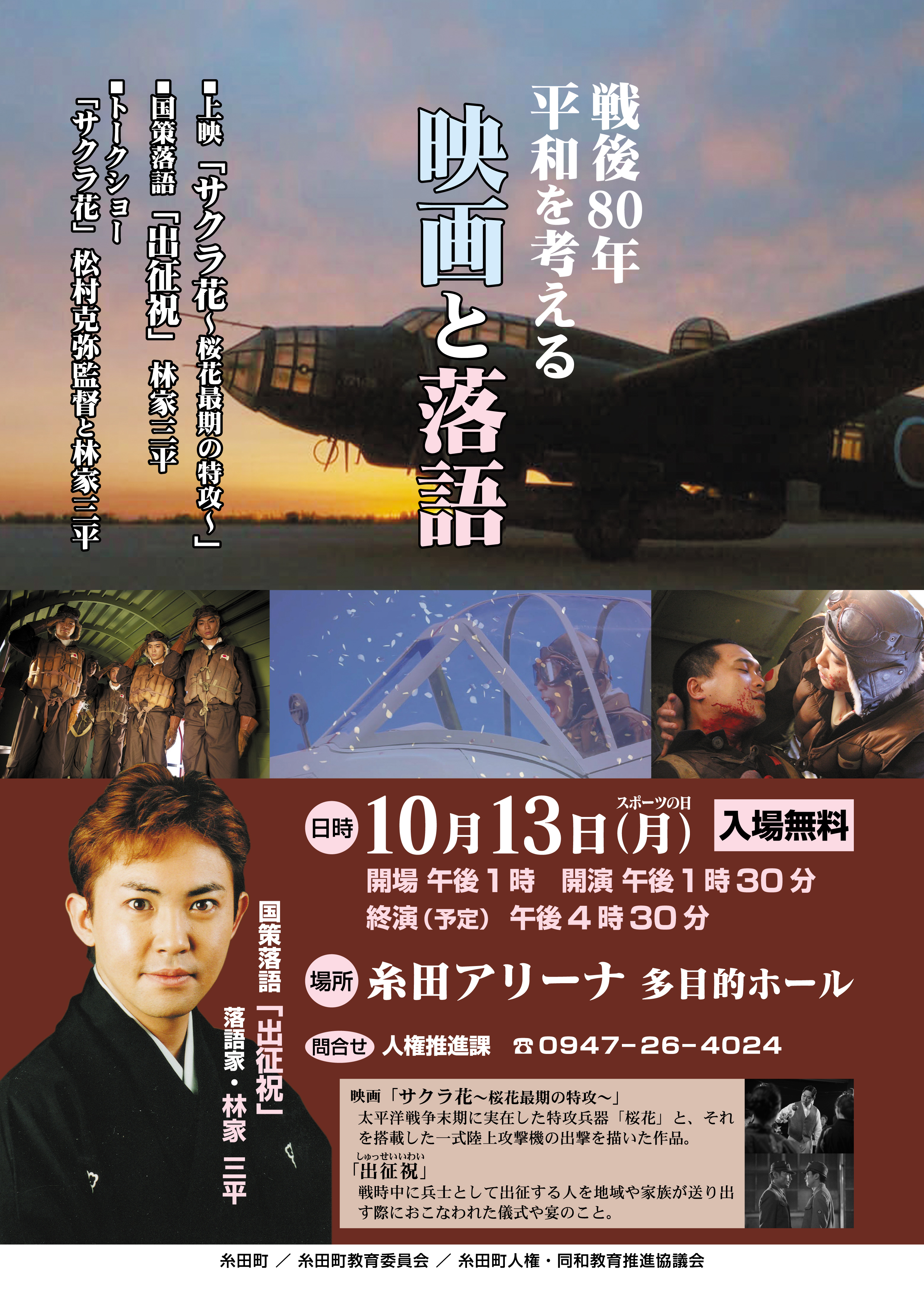 特攻兵器「桜花」を載せた一式陸上攻撃機が沖縄へと向かう特攻出撃の際の機内の出来事を描いた映画「サクラ花―桜花最期の特攻―」を上映し、併せて林家三平氏による国策落語の落語会を行います。