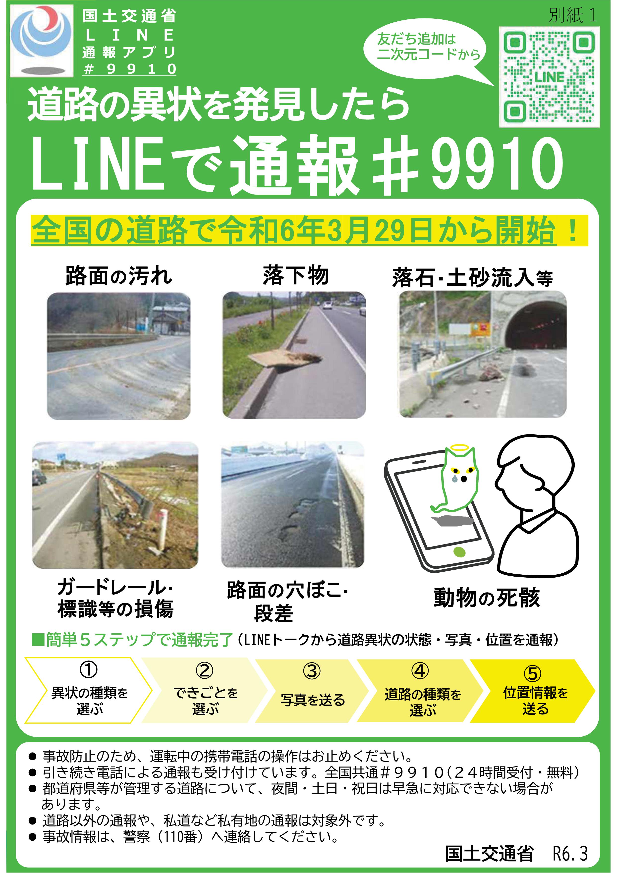 道路に落下物や落石・土砂崩れがあったり、ガードレールや標識の損傷や動物の死骸を見かけたりなど道路の異状を発見した場合は、国土交通省LINEアプリで通報してください。 次の簡単5ステップで通報完了します!(LINEトークから道路異状の状態・写真・位置を通報) ①異状の種類を選ぶ ②出来事を選ぶ ③写真を送る ④道路の種類を選ぶ ⑤位置情報を送る 詳細は国土交通省HPからご確認ください。