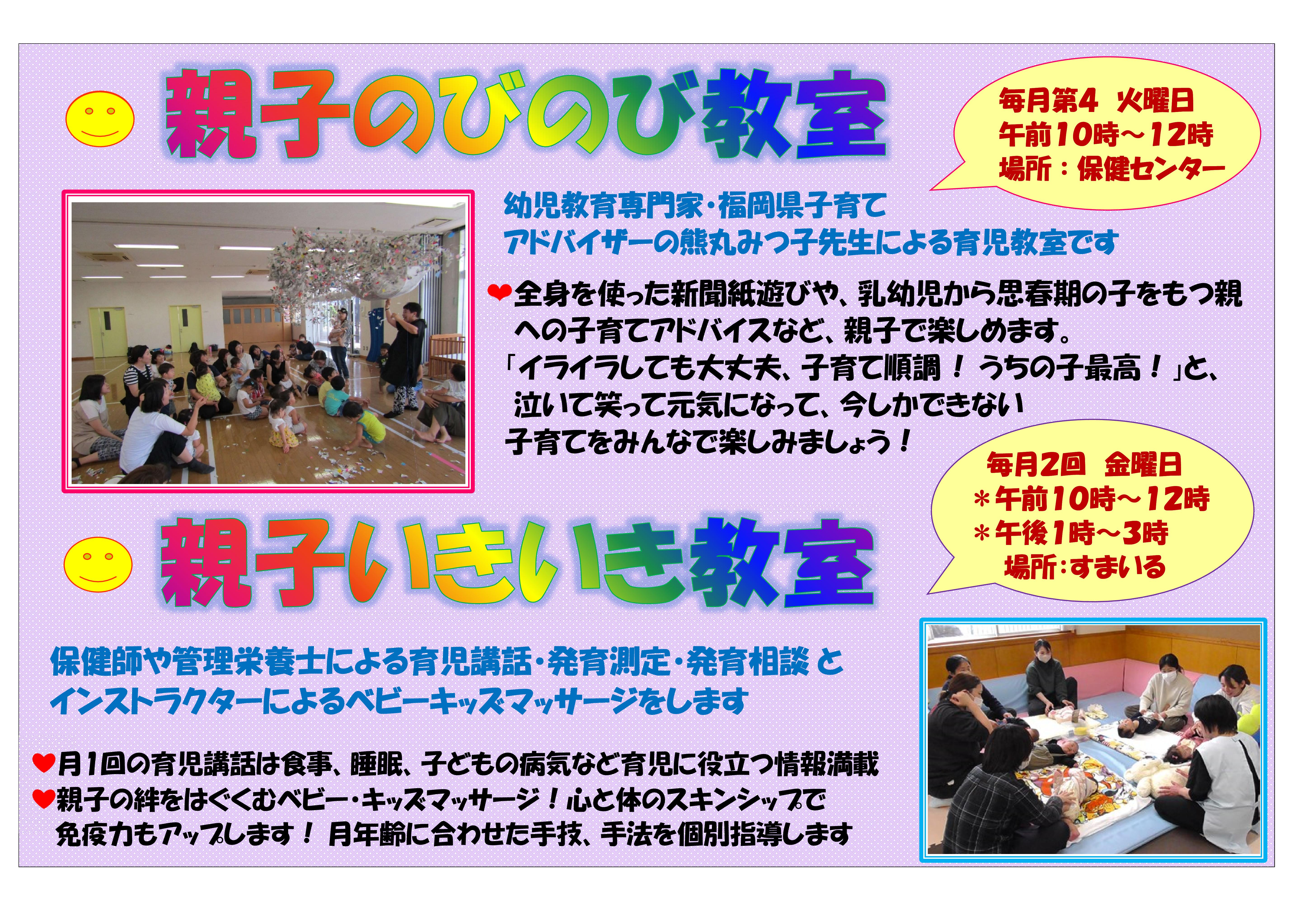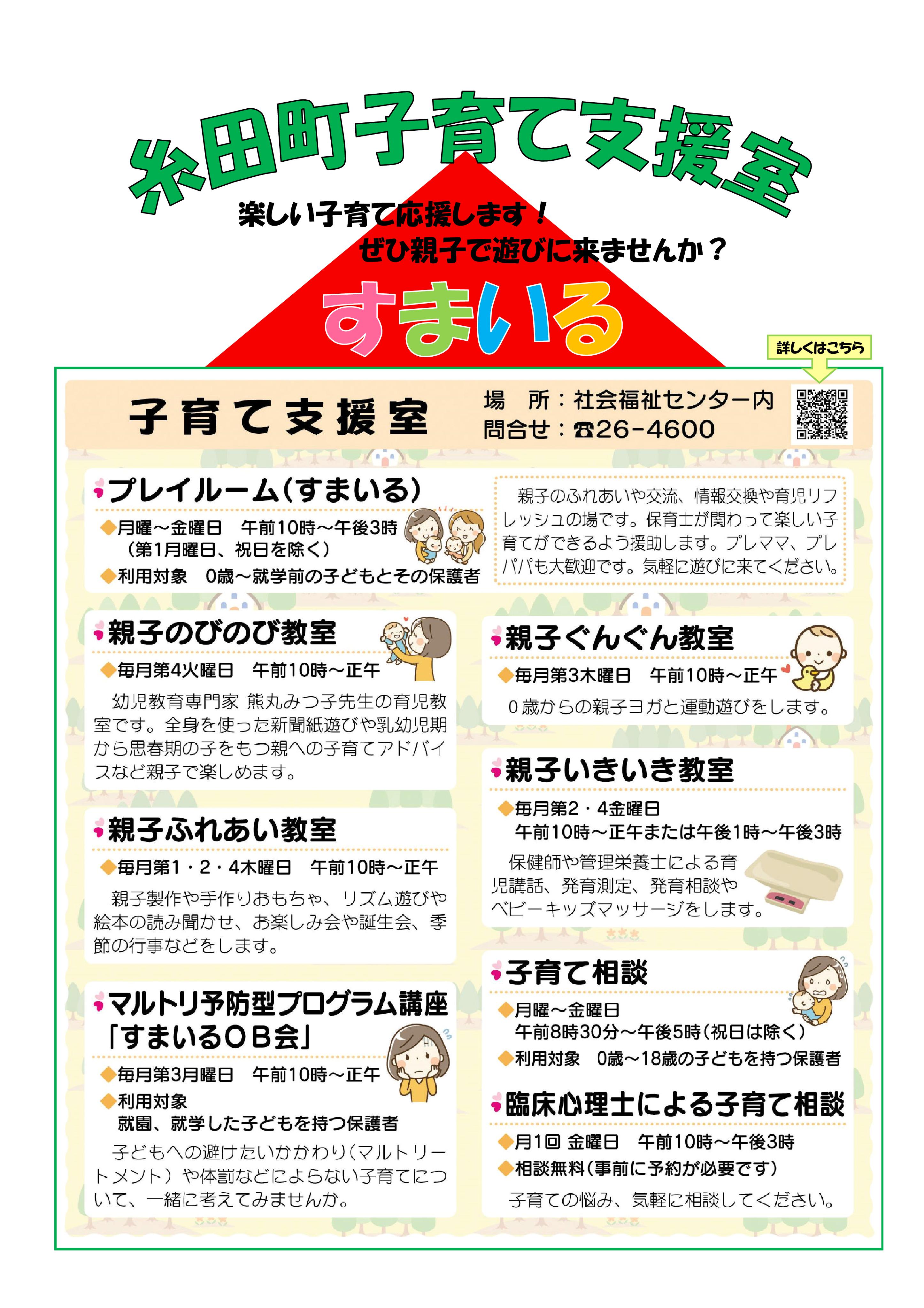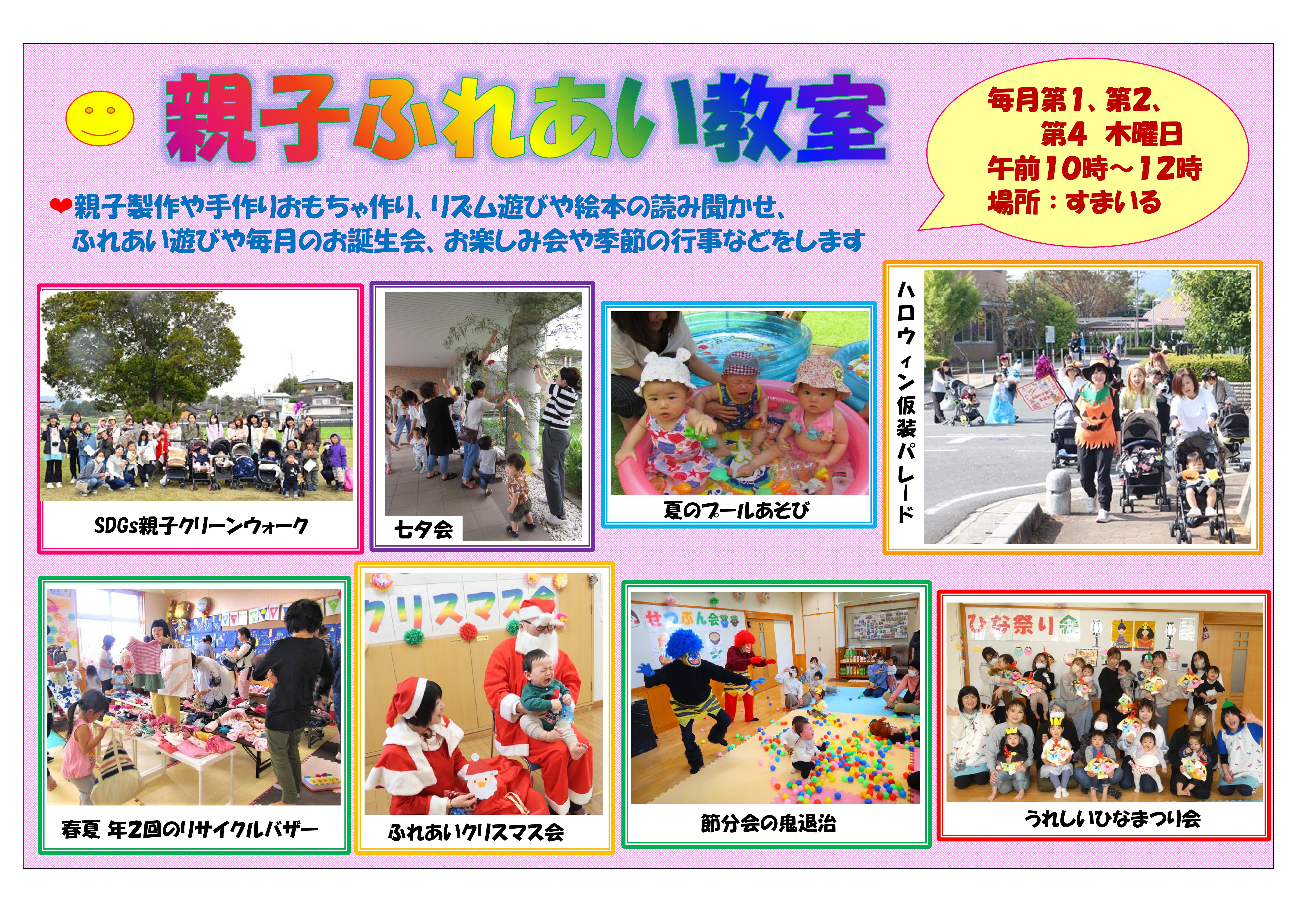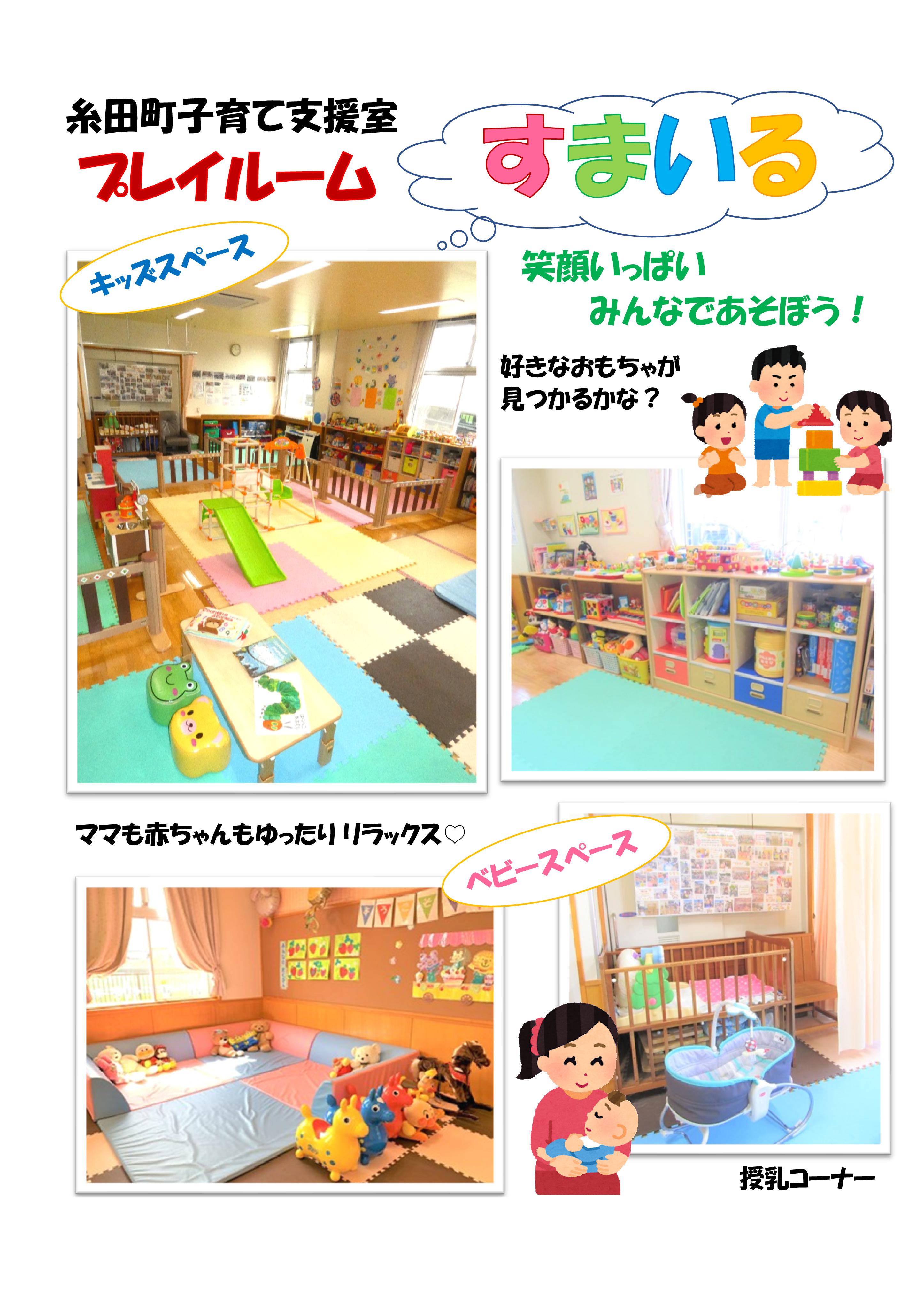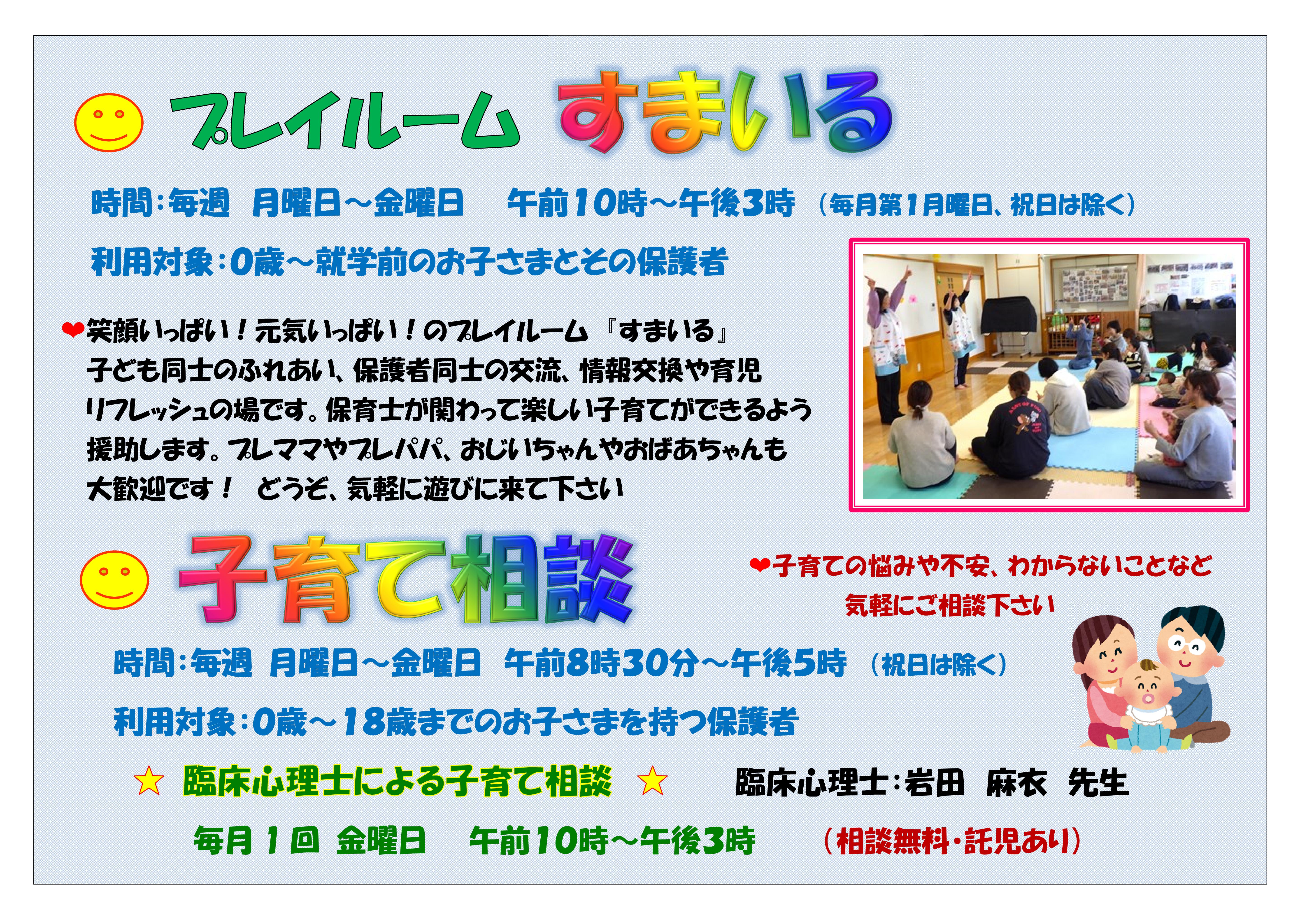 おかげさまで開室から14年目を迎えました。プレイルーム「すまいる」は、ふれあいの場であり、情報交換や育児リフレッシュのできる場です。お父さん、お母さんだけでなく、プレママ、プレパパも大歓迎です。おじいちゃん、おばあちゃんもお孫さんを連れて気軽にご利用ください。家庭内だけでの子育ては、大人にとっても子どもにとってもストレスの元。たくさんの出会いや笑顔あふれる関わりの中で、豊かな心は育ちます。子育てには地域の支えあいが必要です。同支援室は、これからもみなさんと共に手を取りあって、楽しい子育てができるよう応援していきます!令和7年度 プレイルームのご利用とイベント案内