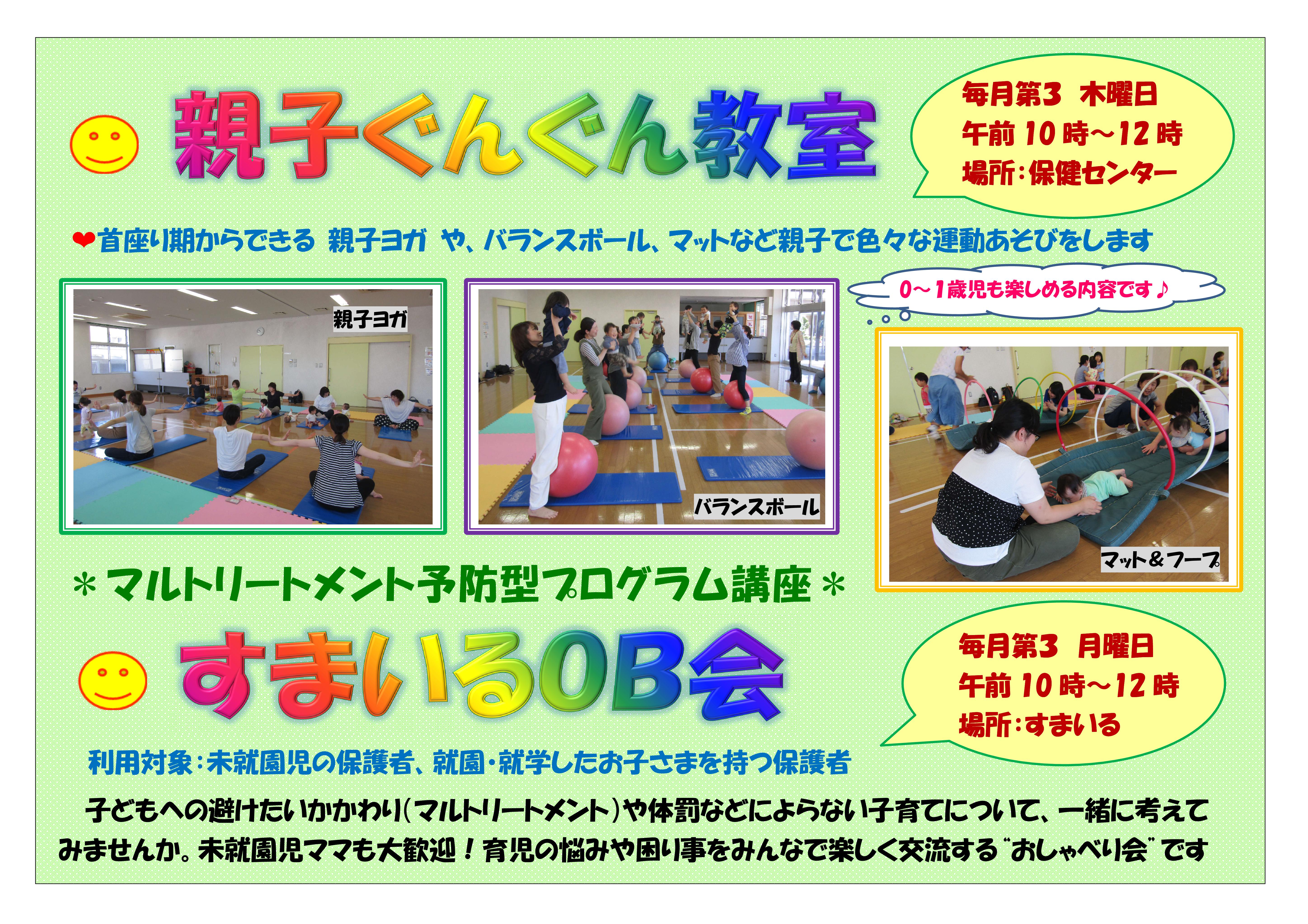 おかげさまで開室から14年目を迎えました。プレイルーム「すまいる」は、ふれあいの場であり、情報交換や育児リフレッシュのできる場です。お父さん、お母さんだけでなく、プレママ、プレパパも大歓迎です。おじいちゃん、おばあちゃんもお孫さんを連れて気軽にご利用ください。家庭内だけでの子育ては、大人にとっても子どもにとってもストレスの元。たくさんの出会いや笑顔あふれる関わりの中で、豊かな心は育ちます。子育てには地域の支えあいが必要です。同支援室は、これからもみなさんと共に手を取りあって、楽しい子育てができるよう応援していきます!令和8年度 プレイルームのご利用とイベント案内